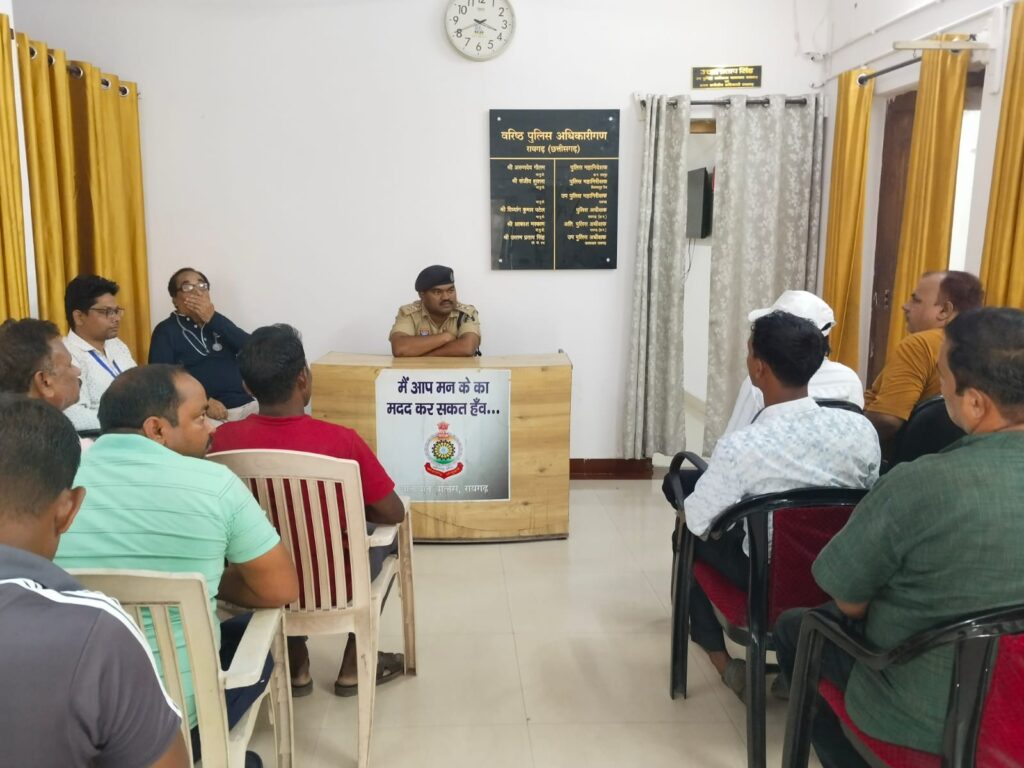 रायगढ़ पुलिस अधीक्षक श्री दिव्यांग पटेल के दिशा निर्देशन पर सड़क सुरक्षा के प्रति जागरूकता बढ़ाने हेतु डीएसपी ट्रैफिक श्री उत्तम प्रताप सिंह द्वारा विशेष पहल करते हुए शहर के विभिन्न स्कूलों में संचालित स्कूल वेन और निजी ऑटो चालकों की बैठक थाना यातायात में आयोजित की गई। बैठक में विद्यार्थियों की सुरक्षा को सर्वोच्च प्राथमिकता देते हुए डीएसपी ट्रैफिक ने सभी चालकों को स्पष्ट निर्देश दिए कि किसी भी स्थिति में बच्चों की सुरक्षा में लापरवाही बर्दाश्त नहीं की जाएगी।