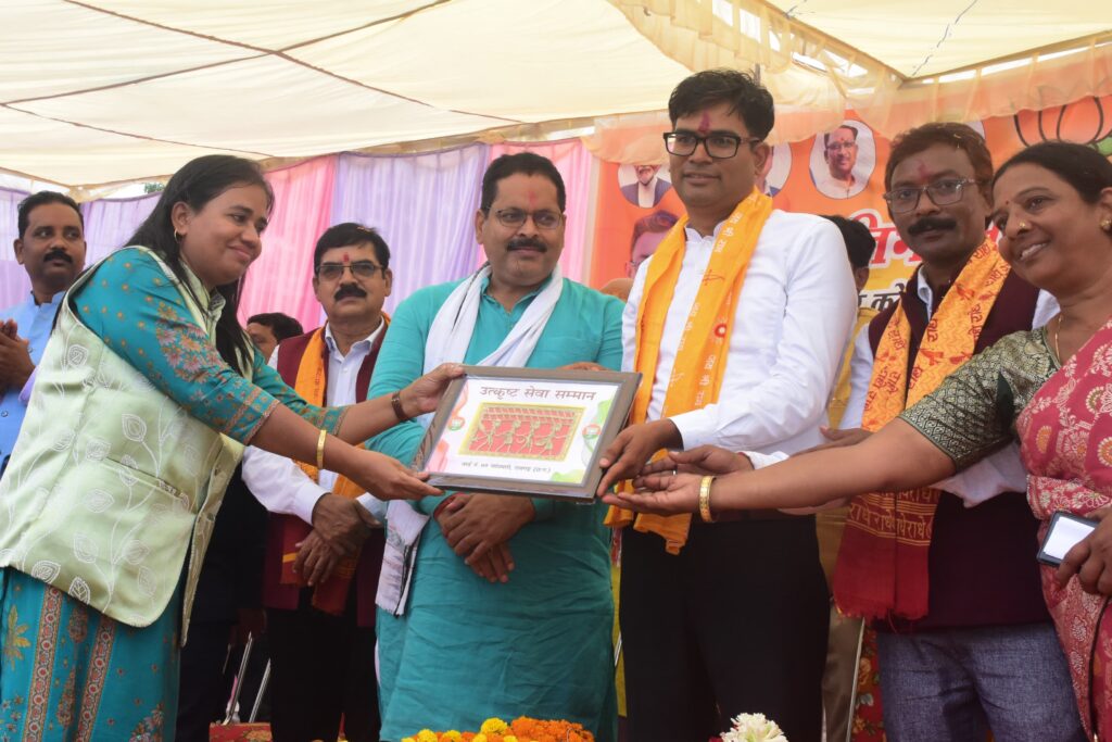 रायगढ़ वार्ड नंबर 09 में स्थित चॉंदमारी सामुदायिक भवन में जनहितैषी, सक्रिय एवं जुझारू पार्षद द्वय अमित शर्मा व ज्योति यादव के संयुक्त प्रयास से आयोजित आत्मनिर्भर संकल्प अभियान से प्रेरित होकर आत्मनिर्भर भारत की ओर बढ़ते कदम सम्मान समारोह जिसमें रायगढ़ शहर की गर्वीली बेटी राज्यपाल पुरस्कार से अलंकृत डॉ.मनीषा त्रिपाठी प्रधान पाठक शासकीय रविशंकर प्राथमिक शाला रायगढ़ को उनकी बहुमुखी प्रतिभा, नवाचार, उत्कृष्ट अध्यापन कार्य सह विद्यालय संचालन, सतत् रुप से विद्यार्थियों के सर्वांगीण विकास, साहित्य एवं समाज सेवा हेतु उत्कृष्ट सेवा सम्मान से सम्मानित किया गया।कार्यक्रम के मुख्य अतिथि रायगढ़ के लोकप्रिय विधायक, वित्त एवं वाणिज्य कर मंत्री माननीय ओमप्रकाश चौधरी ने रायगढ़ डॉ.मनीषा त्रिपाठी को स्मृति चिन्ह देकर सम्मानित किया एवं उनके द्वारा किए जा रहे कार्यों की प्रशंसा करते हुए चाॉंदमारी स्कूल व संकुल का गौरव बताया।इस अवसर पर रायगढ़ नगर पालिक निगम महापौर जीवर्धन चौहान, सभापति डिग्री लाल साहू, भाजपा जिलाध्यक्ष अरुणधर दीवान , भाजपा जिलाध्यक्ष महिला मोर्चा शोभा शर्मा , समस्त वार्ड पार्षद ज्योति यादव,अमित शर्मा,मो.नवाब खान,अन्नू सारथी(08,09,10,11), महेन्द्र यादव (विधि प्रकोष्ठ),अन्य भाजपा पदाधिकारी, सदस्यगण एवं वार्ड वासियों की उपस्थिति रही।.मनीषा त्रिपाठी को अनेकों सम्मान जिसमें मुख्यतः गुरु सम्मान, महिला शिखर सम्मान, सद्भावना शिखर सम्मान,आदर्श शिक्षक सम्मान, नारी शक्ति सम्मान, मुख्यमंत्री गौरव अलंकरण एवं राज्य शिक्षक सम्मान से सम्मानित हुई हैं।इस हेतु उनको इष्ट मित्रों,शुभचिंतकों, विभिन्न संगठनों एवं वार्ड वासियों ने उनके उज्जवल भविष्य की कामना करते हुए बधाईयां संप्रेषित की हैं।