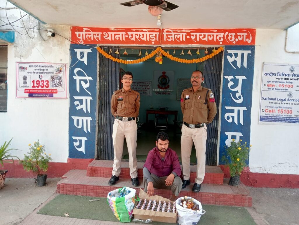 रायगढ़ एसपी श्री दिव्यांग पटेल के दिशा निर्देशन पर कल दिनांक 19 नवंबर 2025 को घरघोड़ा पुलिस ने थाना प्रभारी निरीक्षक कुमार गौरव साहू के नेतृत्व में अवैध शराब कारोबार पर बड़ी कार्रवाई करते हुए ग्राम रायकेरा में दबिश देकर भारी मात्रा में अंग्रेजी और देशी शराब बरामद की। पुलिस को मुखबिर से सूचना मिली थी कि रायकेरा निवासी रूपेश बेहरा अपने घर में अवैध रूप से अंग्रेजी व देशी शराब बिक्री के लिए संग्रहीत कर रखा है। सूचना की तस्दीक पर की गई रेड कार्रवाई में आरोपी रूपेश बेहरा पिता जिकर लाल बेहरा (35 वर्ष) निवासी रायकेरा के घर से गोआ स्पेशल अंग्रेजी शराब के 48 पाव, मैकडावल नंबर 1 के 20 पाव, ग्रीन लेवल के 7 पाव, बैगपाइपर के 4 पाव, कुल 79 पाव अंग्रेजी शराब जिसकी कीमत 11,720 रुपये तथा 66 पाव देसी प्लेन शराब जिसकी कीमत 5,280 रुपये को मिलाकर कुल 145 पाव (26 लीटर 100 एमएल) अवैध शराब (17 हजार रूपये) बरामद की गई। इसके अलावा शराब बिक्री की 2,000 रुपये नगद रकम भी जब्त की गई। आरोपी द्वारा अवैध रूप से शराब रखकर बिक्री करना पाया जाने पर थाना घरघोड़ा में अपराध क्रमांक 307/2025 धारा 34(2), 34(ख) आबकारी अधिनियम के तहत अभियोग पंजीबद्ध किया गया है। कार्रवाई में थाना प्रभारी निरीक्षक कुमार गौरव साहू के साथ प्रधान आरक्षक अरविंद पाठनायक,आरक्षक भानु चंद्रा,प्रदीप तिग्गा,उधो पटेल एवं महिला आरक्षक सुप्रिया सिदार की महत्वपूर्ण भूमिका रही।