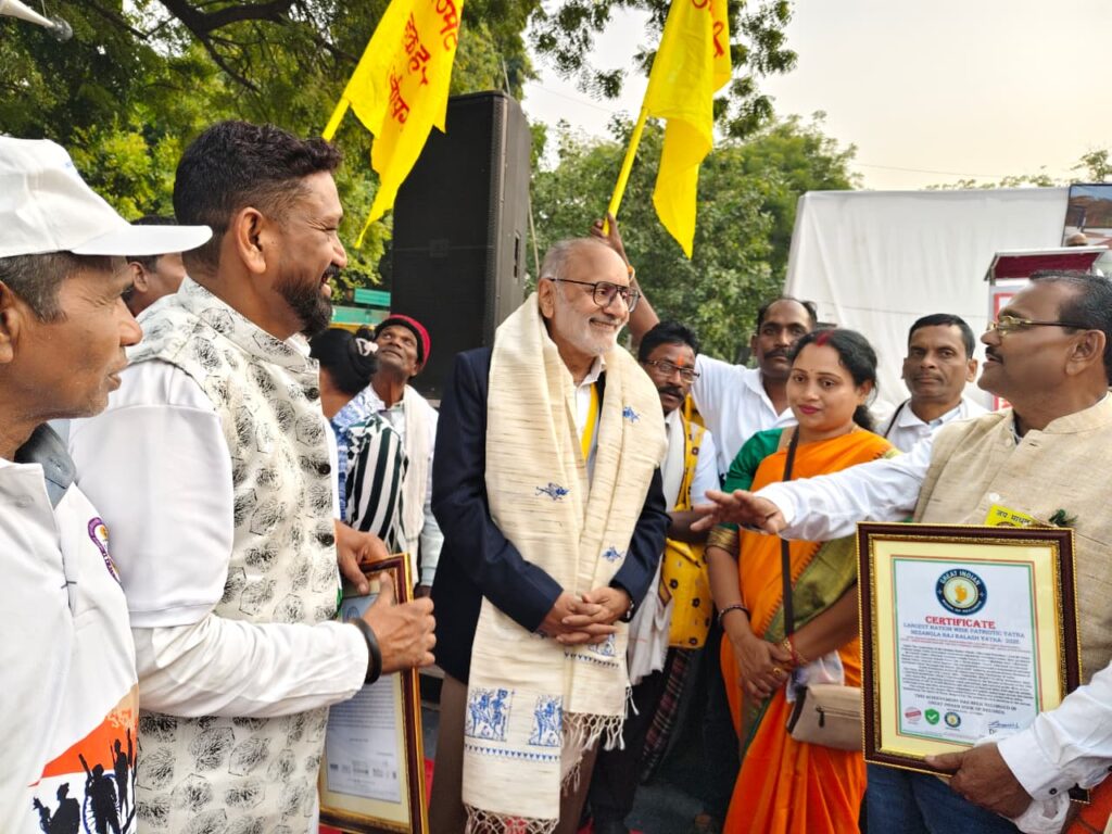 रायगढ़ अखिल भारतवर्षीय यादव महासभा द्वारा विश्व की सबसे लंबी रिकार्ड बनाने वाली रेजांगला शहादत शौर्य कलश यात्रा का दिल्ली के जंतर-मंतर पर शहीदों को श्रद्धांजलि अर्पित करते हुए भव्य समापन समारोह का आयोजन हुआ। विश्व की सबसे लंबी कलश यात्रा को तीन तीन अवार्ड मिले। केन्द्र सरकार से अहीर रेजिमेंट बनाने की मांग की गई। आगामी समय मे दुसरा चरण शुरू होगा। विदीत हो कि बिहार के छपरा से 13 अप्रैल 2025 को प्रारंभ हुई रेजांगला कलश यात्रा देश के 22 राज्यों मे भ्रमण करते हुए 18 नवंबर 2025 तक एक लाख किलोमीटर से अधिक यात्रा की गई। जो कि इस यात्रा के पहले किसी भी संगठन ने इतनी लंबी यात्रा नही की थी । लगभग सात माह समय लगा। और इसको विश्व की सबसे लंबी यात्रा के तीन तीन अवार्ड प्राप्त हुई। समापन समारोह कार्यक्रम में सभी राज्यों के प्रमुख पदाधिकारीयों सहित यदुवंशी भाई बहनों ने भाग लिया। कार्यक्रम में प्रमुख रूप से अखिल भारतवर्षीय यादव महासभा के राष्ट्रीय अध्यक्ष डॉ स्वपन कुमार घोष राष्ट्रीय कार्यकारी अध्यक्ष मां. श्याम सिंह यादव रा.कार्य.अध्यक्ष सोमप्रकाश यादव, वरिष्ठ राष्ट्रीय उपाध्यक्ष एवं शताब्दी समारोह समिति के राष्ट्रीय अध्यक्ष मां. श्री सत्यप्रकाश सिंह यादव जी। राष्ट्रीय उपाध्यक्ष गोविंद भाई कांगड़,राष्ट्रीय उपाध्यक्ष पिताम्बर दास,अहीर रेजिमेंट मिशन के संयोजक बिग्रेडियर प्रदीप यदु राष्ट्रीय महासचिव श्री बलवीर सिंह यादव जी,राष्ट्रीय महासचिव मनोज यादव जी, रेजांगला रज कलश यात्रा के राष्ट्रीय संयोजक एवं राष्ट्रीय महासचिव श्री दिनेश यादव जी,सहसंयोजक प्रवीण यादव,सहसंयोजक किरण यादव,मध्य प्रदेश की पूर्व मंत्री एवं छतरपुर विधायक सुश्री ललीता यादव, पूर्व सांसद एवं राजस्थान के प्रदेशाध्यक्ष डॉ करण सिंह यादव, बिहार के प्रदेशाध्यक्ष गोरेलाल यादव आई ए एस,राष्ट्रीय उपाध्यक्ष जगराम यादव जी, उत्तर प्रदेश के प्रदेशाध्यक्ष अशोक यादव जी, मध्य प्रदेश के प्रदेशाध्यक्ष दादा जगदीश यादव जी, राष्ट्रीय सचिव डी आर यादव राजस्थान,राष्ट्रीय महिला प्रकोष्ठ अध्यक्ष मंजू यदु,राष्ट्रीय सचिव इंजी. एस.डी.यादव,छत्तीसगढ़ प्रदेश अध्यक्ष भुनेश्वर यादव, तमिलनाडु के प्रदेशाध्यक्ष राधाकृष्णन यादव जी युवा प्रकोष्ठ के राष्ट्रीय अध्यक्ष प्रदीप बेहरा सचिव डी आर यादव छत्तीसगढ़,दिल्ली प्रदेशाध्यक्ष संजीव यादव,छत्तीसगढ़ महिला प्रकोष्ठ अध्यक्ष ममता यादव,छत्तीसगढ़ प्रदेश महामंत्री अशोक यादव,छत्तीसगढ़ प्रदेश सचिव परमेश्वर धन्नू यादव, प्रदेश सचिव छोटेलाल यादव,युवा प्रकोष्ठ अध्यक्ष मिथलेश यादव, कार्यकारी अध्यक्ष लक्ष्मी यादव प्रदेश उपाध्यक्ष राम आसरे यादव, प्रदेश उपाध्यक्ष कमल यादव, महासमुंद कार्यकारी अध्य