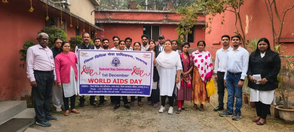 रायगढ़ छ.ग.विधिक सेवा प्राधिकरण बिलासपुर के निर्देशानुसार,प्रधान जिला न्यायाधीश एवं अध्यक्ष श्री जितेन्द्र कुमार जैन के मार्गदर्शन तथा जिला विधिक सेवा प्राधिकरण रायगढ़ न्यायाधीश/सचिव श्रीमती अंकिता मुदलियार के नेतृत्व में 01 दिसम्बर विश्व एड्स दिवस के अवसर पर जिला न्यायालय परिसर रायगढ़ में जागरूकता शिविर का आयोजन किया गया। इस अवसर पर जिला न्यायालय परिसर रायगढ़ में जिला विधिक सेवा प्राधिकरण,रायगढ़ के कर्मचारीगण एवं पैरालीगल वालिंटियर्स द्वारा विश्व एड्स दिवस मनाया गया। जिला न्यायालय परिसर रायगढ़ में उपस्थित विधि के छात्र-छात्राएं एवं परिसर में उपस्थित आमजनों के साथ एचआईवी संक्रमण के बारें में जागरूकता लानेे एवं एड्स के बारे में शिक्षित करने और इस बीमारी के प्रसार को रोकने के लिए प्रयास करने हेतु जानकारी दिया गया। इसी अनुक्रम में प्राधिकरण का मुख्य कार्यो से नालसा द्वारा संचालित योजनाओं के संबंध में जानकारी प्रदान किया गया, आपदा पीड़ितों को विधिक सेवा सहायता,यौन शोषण पीड़ितों के लिए विधिक सेवाएं,श्रमिकों के लिए विधिक सेवाएं,मानसिक रूप से बीमारी और मानसिक रूप से विकलांग व्यक्तियों के लिए विधिक सेवाएं ,संवाद,डॉन,जागृति के बारे में लोगों को निःशुल्क कानूनी सहायता एवं नालसा,सालसा की समस्त योजनाओं से अवगत कराना है। इस प्राधिकरण द्वारा यहॉ महिलाओं को विशेष सुरक्षा एवं सहायता दी जाती है। इस अवसर पर जिला विधिक सेवा प्राधिकरण, रायगढ़ के कर्मचारीगण श्री गिरीश साहू, श्री देवनंदन साहू,श्री रविन्द्र बेहरा,श्री उजागर सिंह चौहान,एवं पैरालीगल वालिंटियर्स,हरीश षडंगी,आयुश देवांगन,रश्मि बेहरा,वृहस्पति सिदार,तरूण बेहरा लीगल एड डिफेंस कौंसिल के स्टॉफ भ्रमर गुप्ता,रमेश कुमार डनसेना,अभिषेक शर्मा,विधि के छात्र-छात्राएं एवं जनसामान्य उपस्थित रहे।