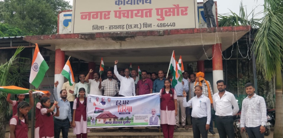 रायगढ़ (पुसौर)आजादी के अमृत महोत्सव के अंतर्गत 09 से 15 अगस्त तक स्वतंत्रता सप्ताह मनाया जा रहा है।जिसमें हर घर तिरंगा कार्यक्रम का आयोजन किया जा रहा। जिसके अंतर्गत सभी भारतीय नागरिकों को राष्ट्रीय ध्वज को अपने घर पर फहराने के लिए प्रेरित किया जा रहा है।आज हर घर तिरंगा अभियान के तहत नगर पंचायत पुसौर में संचालित शासकीय एवं अशासकीय स्कूली छात्र-छात्राओं गुरूजनों एवं नागरिको, जनप्रतिनिधि के द्वारा वृहद तिरंगा रैली में मुख्य अतिथि के रूप रायगढ़ के पूर्व विधायक श्री विजय अग्रवाल जी शामिल हुयें।तिरंगा रैली नगर पंचायत पुसौर के प्रांगण से निकलकर नगर पुसौर के मुख्य मार्ग होते हुये बीच बस्ती से मेनरोड होते हुये वापस नगर पंचायत कार्यालय में समापन हुआ। इस अवसर पर मुख्य अतिथि पूर्व विधायक विजय अग्रवाल ने कहा कि प्रधानमंत्री श्री नरेद्र मोदी जी द्वारा हर घर तिरंगा अभियान को शुरू करने का मुख्य उद्धेश्य देश के हर घर में राष्ट्रीय ध्वज तिरंगा को प्रदर्शित करने के लिए प्रोत्साहित करना है। ताकि देश के नागरिकों में राष्ट्रीय एकता और गौरव को बढ़ाया जा सकें।उन्होंने कहा कि हर घर तिरंगा अभियान देश प्रेम की भावनाओं से जुड़ा है और यह गौरवन्वित करने वाला क्षण है। हम अपने तिरंगा का सम्मान करते है यह हमारे देश की पहचान होने के साथ ही हम सभी भारतवासियों में देश प्रेम की भावना विकसित करता है। हम सभी भारतीय हर घर तिरंगा अभियान से जुड कर देश के स्वतंत्रता सेनानियों ,वीर सपूतों को सम्मान दें। पुसौर के स्कूली छात्र-छात्राओं ने रैली निकालकर हर घर तिरंगा अभियान में जुड़ने एवं तिरंगा के सम्मान हेतु आह्नान कियें। पुसौर में आयोजित हर घर तिरंगा रैली के मुख्य अतिथि पूर्व विधायक विजय अग्रवाल,पुसौर नगर पंचायत उपाध्यक्ष मोहित सतपथी,नगर पंचायत पुसौर CMO क्षितिज कुमार सिंह,पूर्व पार्षद सुरेश महाणा,भाजपा नेता अंशु साव,पार्षद प्रतिनिधि ओकेश बेहरा,पूर्व एल्डरमेन विजय महाणा, मंडल महामंत्री संजय जी,वरिष्ठ भाजपा नेता अमृत सिंह जटाल,पूर्व जनपद सस्दय जागेश्वर गुप्ता,अरूण गुप्ता,अशोक गुप्ता,उपेन्द्र,पार्षद निराकर पटेल,पार्षद उमेश साव,अभिनव विद्या मंदिर के संचालक अक्षय सतपथी,स्वामी आत्मानंद स्कूल के प्राचार्य महोदय,आर्य विद्यासागर मंदिर संचालक अनिल कुमार यादव, हाई स्कूल के प्राचार्य एवं समस्त शिक्षकगण एवं सभी स्कूल के छात्र-छात्राएं शामिल हुयें।