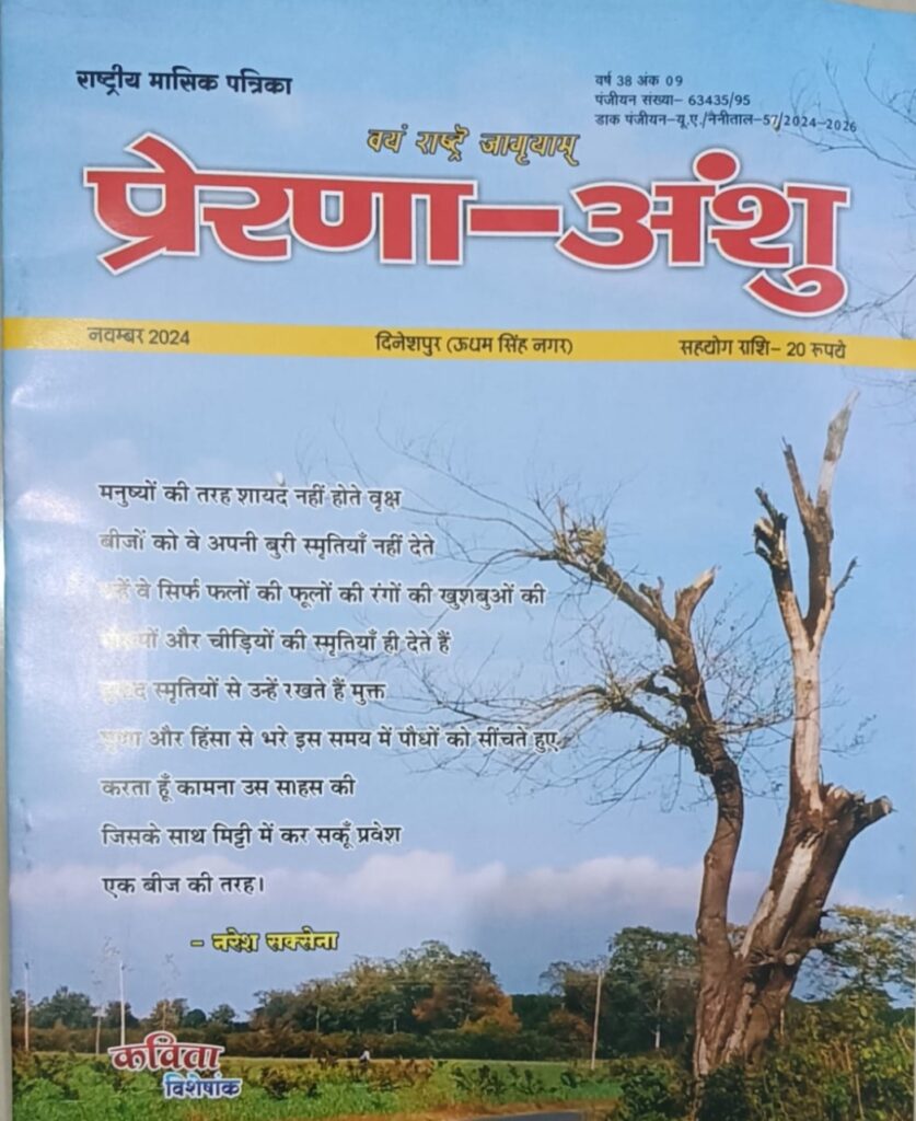 रायगढ़ उत्तराखंड के दिनेशपुर से निकलने वाली मासिक पत्रिका ‘प्रेरणा अंशु’का नवंबर 2024 अंक कविता विशेषांक है।अंक में शामिल कविताओं को पढ़ने के उपरांत महसूस होता है कि पत्रिका के संपादक पलाश विश्वास जी ने इस अंक का बड़े मनोयोग से संपादन किया है। लगभग 800 कवियों की कविताओं में से चुनिंदा 53 कवियों की छोटी छोटी कविताएँ यहां ली गयी हैं। इस अंक में लोक जीवन की जड़ों से गहरे जुडीं बहुत जरूरी कविताओं को शामिल किया जाना अच्छे संपादन का प्रतीक है ।ये कविताएँ अपने समय में सार्थक हस्तक्षेप भी करती हैं। अंक में नए पुराने कवियों की उपस्थिति उनकी अच्छी कविताओं के साथ दर्ज हुई है।आज बसंत राघव के निवास पर शहर के कविता प्रेमी पाठकों के लिए अनौपचारिक रूप से इसका लोकार्पण किया गया। प्रेरणा अंशु परिवार को इस कविता अंक के लिए हार्दिक बधाई भी प्रेषित की गई।अंक में रमेश शर्मा की भी दो कविताएँ शामिल हैं,लोकार्पण उपरांत जिसका पाठ किया गया।