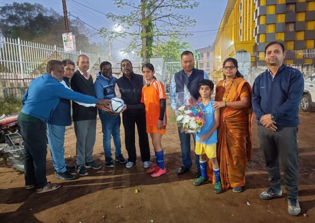 रायगढ़ सैलजा गहलोत फुटबॉल का राष्ट्रीय स्तर में चयन होने पर नगर पालिका निगम की प्रथम नागरिक जानकी काटजू, अमृत काटजू,पार्षद शाखा यादव,विकास ठेठवार,एवं जिला फुटबॉल संघ के अध्यक्ष मुकेश चटर्जी,सचिव संजय ठाकुर, जैम्स वर्गीस ने अभ्यास ग्राउंड नटवर स्कूल मैदान में जाकर गुलदस्ता भेंट किया और साथ ही महापौर जानकी काटजू ने फुटबॉल देकर सम्मानित किया और भविष्य में अच्छे प्रदर्शन की शुभकामनाएं दी सैलजा गहलोत वंडर बॉयज फुटबॉल अकादमी में अपने पिता शारदा सिंह गहलोत की देख रेख में ट्रेनिंग ले रही है जैसा कि 4 दिसंबर को शैलजा गहलोत जम्मू कश्मीर के लिए रवाना हो रही है यह 6 दिसंबर से 10 दिसंबर तक बालिका वर्ग आयु 17 वर्षीय 68 वीं राष्ट्रीय क्रीड़ा प्रतियोगिता आयोजित है । रायगढ़ से एक मात्र फुटबॉल खेल में स्कूल गेम्स ( SGFI ) में इतिहास रचने वाली सैलजा गहलोत बालिका वर्ग पहली खिलाड़ी है इसके अलावा रायगढ़ की कई बेटियों ने रायगढ़ का नाम खेल गतिविधियों रोशन किया है यह हमारा दायित्व होता है कि हम इन बेटियों का हौसला बढ़ाना चाहिए जिससे इनको एक नई ऊर्जा प्रदान हो और अपना और रायगढ़ का नाम खेल गतिविधियों में ऊंचा करे ।
