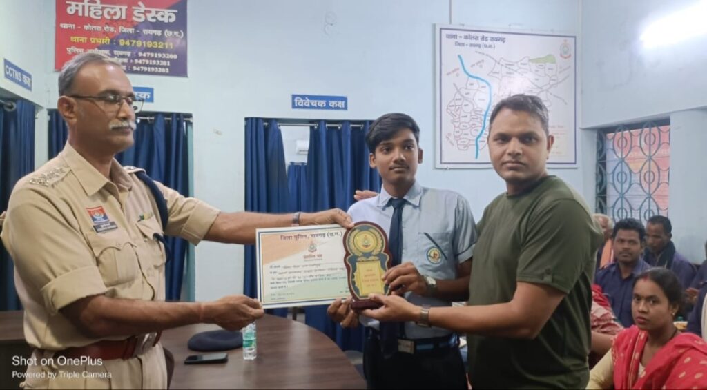 रायगढ़ पुलिस अधीक्षक श्री दिव्यांग कुमार पटेल के निर्देशन में कल थाना कोतरारोड़ में एक प्रेरणादायक कार्यक्रम का आयोजन किया गया,जिसमें समाज के विभिन्न क्षेत्रों में उत्कृष्ट योगदान देने वाले नागरिकों को सम्मानित किया गया। कार्यक्रम की अध्यक्षता उप पुलिस अधीक्षक श्री सुशांतो बनर्जी ने की तथा थाना प्रभारी निरीक्षक मोहन भारद्वाज की मौजूदगी में मेधावी छात्रों, समाजसेवियों और सक्रिय पुलिस मित्रों को प्रशस्ति पत्र व प्रतीक चिन्ह (मेमेंटो) देकर सम्मानित किया गया।सम्मानित नागरिकों में गोरखा स्कूल के व्याख्याता श्री गिरजा पटेल, कोतरा स्कूल के व्याख्याता श्री बीर सिंह, सामाजिक कार्यकर्ता पूजा कंवर तथा कक्षा दसवीं में उत्कृष्ट प्रदर्शन करने वाले स्टेट टापर्स छात्र ईश्वर पटेल (रानीगुड़ा) और रौनिक चौहान (कलमी) शामिल हैं। इसके अलावा आरक्षक चुडामणी गुप्ता,अपराध विवेचना में उत्कृष्ट कार्य एवं पुलिस मित्र के रूप में सराहनीय भूमिका निभाने वाले पुष्पेंद्र त्रिपाठी, कमलेश सारथी धनागर,टीना उरांव (कोसमनारा), जयलाल सारथी तथा बैसपाली ग्राम के लेख राम पटेल को भी प्रशंसा स्वरूप सम्मानित किया गया इस अवसर पर डीएसपी श्री बनर्जी ने सभी सम्मानितजनों को शुभकामनाएं देते हुए समाज कल्याण में सतत भागीदारी बनाए रखने की प्रेरणा दी। उन्होंने नशा मुक्ति अभियान, ‘सुरक्षित सुबह’ सीसीटीवी जागरूकता अभियान तथा सड़क दुर्घटनाओं की त्वरित सूचना देने और घायलों को अस्पताल पहुंचाने वाले ‘गुड सेमेरिटन’ नागरिकों की भूमिका पर भी प्रकाश डाला। कार्यक्रम में थाना कोतरारोड़ का समस्त स्टाफ उपस्थित रहा और समारोह को गरिमामय बनाया।
