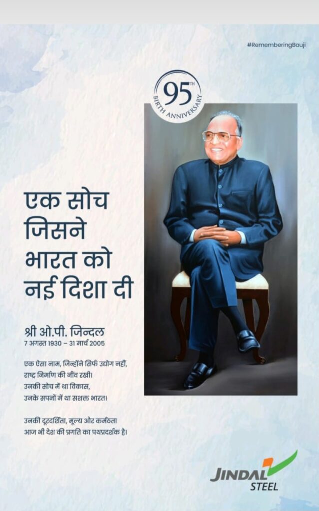 रायगढ़ जिंदल समूह के संस्थापक ओमप्रकाश जिंदल की 95वीं जयंती गुरूवार को धूमधाम से मनाई गई। श्री जिंदल की प्रतिमा पर आदरांजलि देने के साथ सुबह शुरू हुए कार्यक्रम देर शाम तक जारी रहे। किरोड़ीमल नगर में विशाल स्वास्थ्य शिविर का आयोजन किया गया। इसमें सैकड़ों ग्रामीणों ने निशुल्क जांच, उपचार एवं दवाइयों का लाभ उठाया। इसके अलावा शहर और आसपास के सभी वृद्धाश्रमों, अनाथालयों और ऐसी सभी संस्थाओं में भोजन की व्यवस्था के साथ उनकी जरूरत के अनुरूप सामग्री उपलब्ध कराई गई। जिंदल आशा के विशेष बच्चों ने भी उत्साह के साथ श्री जिंदल का जन्मदिन मनाया। मुख्य समारोह में कोसमपाली गांव के बच्चों ने भी शानदार प्रस्तुति से सभी का मन जीत लिया।श्रीयुत ओमप्रकाश जिंदल के जन्मदिवस के अवसर पर आयोजित कार्यक्रमों की शुरूआत जिंदल स्टील परिसर में सेंट्रल बैरियर के पास सुबह 8 बजे हुई। यहां महापौर जीवर्धन चौहान, एमआईसी सदस्य श्रीमती पूनम सोलंकी, नगर पंचायत किरोड़ीमल नगर के अध्यक्ष हरिकिशोर चंद्रा, पूर्व विधायक चैन सिंह सामले सहित अन्य अतिथियों के साथ कार्यपालन निदेशक सब्यसाची बंद्योपाध्याय एवं कंपनी के वरिष्ठ अधिकारियों ने श्री जिंदल की प्रतिमा पर माल्यार्पण कर उन्हें नमन किया। ग्राम कोसमपाली की बालिकाओं द्वारा नृत्य की शानदार प्रस्तुति दी गई। कार्यक्रम के दौरान महापौर श्री चौहान ने बाबूजी को श्रद्धांजलि अर्पित करते हुए उनके जीवन और कार्यों को रायगढ़ सहित राष्ट्र के लिए प्रेरणा स्रोत बताया। उन्होंने कहा कि श्री जिंदल एक दूरदर्शी उद्योगपति ही नहीं, बल्कि सच्चे राष्ट्रभक्त और समाजसेवी थे, जिन्होंने अपने विचारों और कार्यों से रायगढ़ को ‘उद्योग नगरी’ के रूप में पहचान दिलाई। महापौर श्री चौहान ने कहा कि बाबूजी ने न केवल इस्पात और ऊर्जा क्षेत्र में भारत को नई ऊँचाइयों पर पहुँचाया, बल्कि रायगढ़ की धरती पर औद्योगिक विकास की मजबूत नींव रखी। इससे हज़ारों लोगों को रोजगार मिला और क्षेत्र में शिक्षा और स्वास्थ्य जैसी सुविधाओं का भी विस्तार हुआ। उन्होंने कहा “स्वर्गीय जिंदल का जीवन यह सिखाता है कि परिश्रम, ईमानदारी और राष्ट्र प्रेम से किया गया कार्य न केवल व्यक्ति को ऊँचाइयों तक पहुँचाता है, बल्कि पूरे समाज को आगे बढ़ाता है।” एमआईसी सदस्य श्रीमती सोलंकी ने कहा कि ‘श्री जिंदल ने जीवन के हर क्षेत्र में अपनी भूमिका का पूरी तरह से निर्वहन किया। अब उनके पुत्र नवीन जिंदल भी उनके ही रास्ते पर चल रहे हैं।’ उन्होंने रायगढ़ के विकास में जिंदल स्टील के योगदान की सराहना की। नगर पंचायत किरोड़ीमलनगर के अध्यक्ष श्री चंद्रा ने कहा कि ‘जिंदल स्टील के कारण रायगढ़ की पहचान आज विश्व मानचित्र पर बन गयी है। बाबूजी ओमप